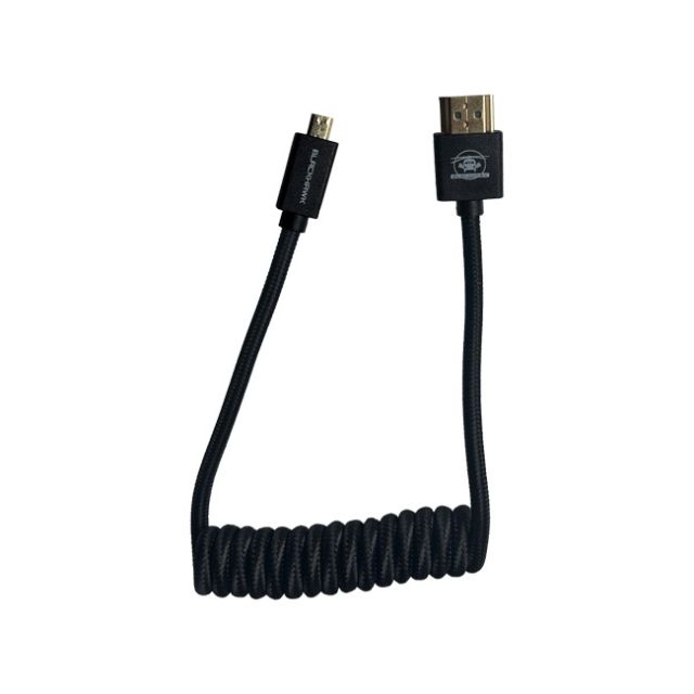 Blackhawk Coiled Micro HDMI to Full HDMI Cable (12-24") A coiled Micro HDMI to Full sized HDMI cable with 12 contracted &24 extended lengths. Connect your video camera to your on-camera monitor with this micro-HDMI to Full HDMI coiled cable. This high-speed cable, with a long-lasting nylon braid, supports 4K, 60Hz, and 3D video. Connector 1: Micro-HDMI Type-D Male Connector 2: Full-HDMI Type-A Male Cable Length: 12"-24" Weight: 1 oz Maximum Resolution Support: 4096 x 2160 at 60 Hz 3D Support: Yes Jacket Type: Nylon