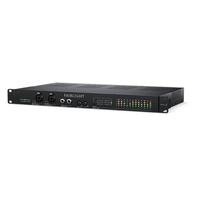 Blackmagic Fairlight Audio Interface Fairlight Audio Interface is a professional audio post production I/O interface with an extensive variety of analog and digital inputs and outputs, preamps for microphones and instruments, built in sample rate conversion, sync at any standard frame rate and dual 9 pin control ports! Fairlight Audio Interface requires Fairlight Audio Accelerator and connects to the Fairlight Audio Interface with a supplied proprietary interface cable. Connections Analog Audio Inputs 2 x remote controlled XLR/TRS microphone inputs with 48v phantom power/instrument preamps. 8 x +24dBu balanced analog inputs. Analog Audio Outputs 12 x +24dBu balanced analog outputs with mute protection. Digital Audio Inputs 9 x fully transformer coupled AES stereo digital inputs. 1 x S/PDIF input with sample-rate conversion. Digital Audio Outputs 11 x AES stereo digital outputs. 1 x stereo digital S/PDIF output. Standard 25pin Tascam interface for Analog and AES looms. Sync Input 1 x 75 ohm BNC Reference input. Tri Sync or Black Burst. 1 x 75 ohm BNC word clock input. Sync Output 1 x 75 ohm BNC Reference loop out. Tri Sync or Black Burst. 1 x 75 ohm BNC word clock regenerated output. Sync to all common frame rates and formats including HD Tri level sync, video sync, word clock and AES/EBU. Device Control 1 x RS-422 9-pin machine control input. 1 x RS-422 9-pin machine control output. Timecode Timecode input and output with regeneration. MIDI For future use GPIO GPI and GPO connections for cough and On Air control Product Specifics Sample Rate 44.1, 48, 96, 192 kHz Max Input Inputs 1-2 (mic): +2.5dBu Inputs 1-2 (instrument): +24dBu Inputs 3-10 (Line): +24dBu Gain Range Inputs 1-2: Mic Inputs: 50dB gain range (+21.5 to +71.5dB) Inputs 1-2 : Instrument Setting: 50dB gain range (+0 to +50dB) Mic E.I.N (unweighted) Inputs 1-2: -127dBu @40dB (61.5dB) Gain: 150 ohm source, 20Hz - 20kHz THD+N (mic input) Inputs 1-2: Inputs 1-2: THD+N (line input) Inputs 1-2: Inputs 3-10 : Dynamic Range (line input) Inputs 1-2 : 108dB @ 0dB gain (unweighted) Inputs 3-10: 110dB (unweighted) Input Frequency Response +0.05/-0.05dB, 20Hz - 20kHz Input Impedance Inputs 1-2 (XLR) : 2k ohm Inputs 1-2 (1/4"): >1M ohm Inputs 3-10: 15k ohm Max Output Outputs 1-12: +24 dBu THD+N (Line Outputs) Outputs 1-12: Dynamic Range (Line Output) Outputs 1-12 : 109 dB (unweighted) Output Frequency Response +0.05/-0.5dB, 20Hz - 20kHz Output Impedance Outputs 1-12 : 50 ohms Operating Systems Mac 10.15 Catalina or later. Windows 10, 64-bit. Power Requirements Power Supply Internal 100 - 240V AC 50/60Hz with IEC C14 mains input. Power Usage 40W Power Management Automatically powered-on/off only when the Fairlight Audio Accelerator is powered on. Physical Specifications Environmental Specifications Operating Temperature 0 to 40 C (32 to 104 F) Storage Temperature -20 to 60 C (-4 to 140 F) Relative Humidity 0% to 90% non-condensing What's Included Fairlight Audio Interface Fairlight Audio Interface multi-pin cable to connect to Fairlight Audio Accelerator. Warranty 1 Year Limited Manufacturer's Warranty.