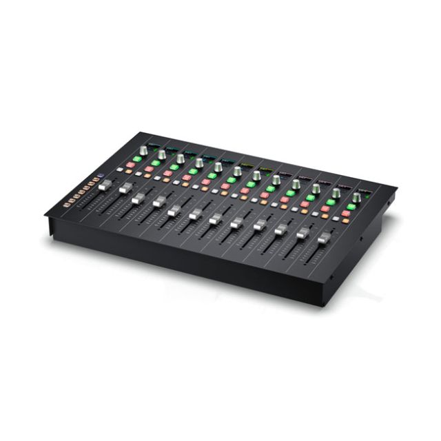 Blackmagic Fairlight Console Channel Fader Features 12 motorized faders, rotary control knobs illuminated buttons for pan, solo, mute and call, plus bank select buttons.