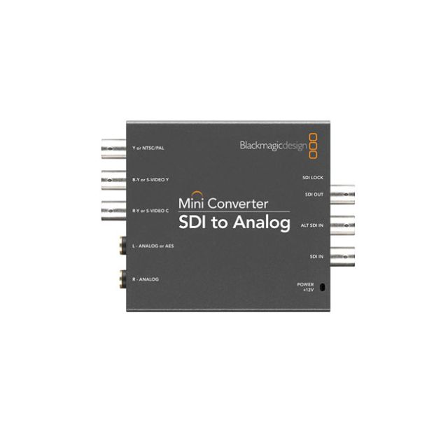Blackmagic Mini Converter - SDI to Analog SDI to Analog Mini Converter SDI to Analog includes everything you need to convert from SDI to analog in HD/SD component, NTSC and PAL video, plus balanced AES/EBU and analog audio. Now you can easily connect equipment such as Betacam SP, VHS, and analog video monitors to SDI based equipment. Auto Switching SD and HD Mini Converters instantly switch between standard definition and high definition video formats and changeover is automatic when the video input changes. A huge range of video standards are supported including, NTSC, PAL, 1080i/59.94, 1080i/50, 1080psf/23.98, 1080psf/24, 720p/59.94 and 720p/50 formats, plus new formats can be added via USB. Redundant SDI Input Mini Converters feature a unique redundant input for mission critical tasks such as broadcast or live events. You can connect a redundant cable to the second input, so if the main input is lost due to cable damage or any other cause, Mini Converter will automatically switch over to the redundant input cable. This lets you use Mini Converters in locations where crowds or the environment might cause cable damage, or lets you place Mini Converters in hard to reach locations such as roof mounted video projectors. A loop though SDI output is also provided for connecting to other devices. A loop-thru SDI connection is also great if you need more than 2 audio channels, as you can connect the loop-thru to another Mini Converter to de-embedd extra audio channels! New 3 Gb/s SDI Technology Only Mini Converters include the latest 3 Gb/s SDI technology and upgrades can be loaded via the built in USB connection for future video format compatibility. 3 Gb/s SDI is also fully compatible with all your standard definition and high definition SDI equipment. Built in AES/EBU or Analog Audio Standard 1/4 inch jacks are built in for balanced analog or AES/EBU audio. Because Mini Converters use standard 1/4 inch jack connectors for all audio connections, you can use standard cables commonly available from any pro audio store. Unlike other converters, Mini Converters don't need custom cables, as any balanced 1/4 inch jack cable can be used. Mini Converters are also unique as the same 1/4 inch jack connections can be switched between professional balanced analog audio, or AES/EBU digital audio. This means you only need one model of Mini Converter for both analog and digital audio. You can select the type of audio from one of the mini switches on the side of the Mini Converter unit. On modes with AES/EBU digital audio in, a sample rate converter lets you connect to any AES/EBU source, either synchronized, or un-syncronized. On HDMI models, you also have full access to the HDMI audio embedded in the HDMI video connection. High Quality Mini Converters are built to highest quality standards with low SDI jitter so you get the longest SDI cable lengths combined with multiple internal power supplies for ultra low noise broadcast quality analog video and audio. Unlike other converters, Mini Converters don't use "low grade" video electronics just to save cost. Mini Converters feature the highest grade broadcast quality analog audio and video electronics. In fact, Mini Converters uses the same analog video design as our most expensive and award winning Multibridge Eclipse! That means you get the highest quality, all in a very affordable and incredibly compact unit.