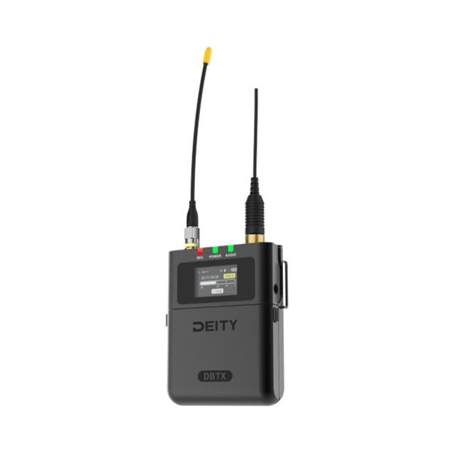 Deity DBTX D-UHF Bodypack Transmitter (US) Features Global OneBand: 550-960MHz for possible frequencies The transmitter features a built-in recorder* for alternative use True Multi-ADC 32-bit Float Supports MicroSD card; up to 128GB in size Wirelessly sync timecode to the Deity TC-1; Hard-wire jam via 3.5mm Supports remote control functionality via the Sidus Audio app Ultra-Long battery life Up to 100mW RF Power; Up to 300ft Range Dimensions(H x Wx D) 88.45x 65x17.8 mm Wideband UHF Spectrum The Deity DBTX sets itself apart by using an ultra-broad UHF spectrum. This transmitter's frequencies range from 550-960 MHz. (The actual band size and spectrum will depend on where the device is used). Wireless Timecode Sync The Theos ecosystem's most unique feature is that the transmitter can be natively synced wirelessly from the Deity TC-1 timecode generator. Timecode ensures your alternative WAV files will sync with your camera footage in post. Alternatively, the DBTX can be synced via the 3.5mm jack if you are using 3rd party timecode generators. Remote Control via Sidus Audio App The DBTX allows for remote control functionality through the Sidus Audio app. With this app, you can easily adjust gain staging, low-cut filters, and more. This feature eliminates the need to physically handle the device, making it much more convenient when working on set. SMA Antenna Ports The DBTX comes with a SMA antenna port, which allows you to swap out antennas to fine-tune your frequency or replace them if they get damaged. This feature makes transporting your gear more compact in its case, which is especially useful when working on location. *US Models of the DBTX can not transmit and record at the same. In The Box : 1x DBTX - THEOS Transmitter 1x W.Lav Pro 3.5mm TRS 1x Belt Clip 2x AA Lithium Batteries 3x UHF-TA Antenna (Various Frequencies) 1x 32GB MicroSD Card 1x USB-C to USB-A Firmware Update Adapter