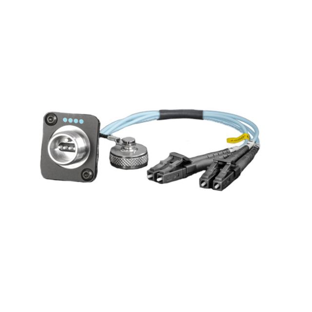 FieldCast 4Core MM Chassis Connector 4Core SM Chassis Connector *** MM= Multimode 50/125 OM3 Fiber Core 4Core connector for mounting in a chassis or 19 inch panel, with standard D-size form factor, that connects to your 4Core main cable. At the back it sports a 0.5 meter fanout with LC Duplex connector. Specs four cores of protected fiber multimode 50/125 OM3 color coded (four blue rings for 4Core multimode) female chassis connector on one side 2x LC Duplex back outlet on other side outlet cable length 50 cm. product code: c9060 highest quality Rosenberger OSI female chassis connector connects FieldCast cable to equipment with standard LC fiber connectivity standard 0.50m back outlet, other lengths on request standard LC connectors on outlet, PC polished, other connectors on request 2Core with two LC connectors on outlet, 4Core with four LC connectors on outlet