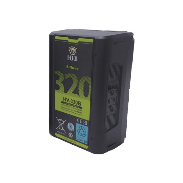 IDX 308Wh 28.8V Li-ion B-Mount Battery IDX System Technologies is pleased to introduce the HV-320B 28.8V Li-ion B-Mount Battery. The IDX HV-320B is a newly developed B-Mount battery as a part of the IDX CinePower line. Power your B-Mount camera and pro video accessories with this high-capacity 28.8V, 320Wh B-Mount Battery. The IDX HV Series of batteries are robust and versatile, and the battery s B-Mount interface enables powering B-Mount accessories, cameras, or lights. In addition, the HV Series also has D-Tap, USB-A and USB-C that can supply power to a variety of devices. The USB PD (Power Delivery) input/output compatible, supporting up to PD 100W charging and up to PD 60W discharging supporting the digital interface for the cameras. IDX s HV-320B utilizes newly developed cell technology with high energy type and support over 10A capacity. Main Features ARRI standard B-Mount and digital interface Capacity: 307.30Wh (10.7Ah) DC 28.7V Output (Main Connector) Multiple Input and output D-Tap out, USB-A, and USB-C PD Product Specifications Cell Chemistry: Lithium ion Nominal Voltage: DC 28.72V Operation Voltage: DC 22V 33.6V Main Connector: Maximum Load: 275W D-Tap Output: 75W 15V/5A USB Output: Type-C PD 100W in/out (5V/3A, 9V/3A, 12V/3A, 15V/3A, 20V/5A) Type-A 5V/2.3A output Built-in OLED: Run time, Remaining capacity, supplied power, Battery life and other information are displayed Dimensions: 4.13in(W) x 6.14in(H) x 2.67in(D) Weight: 3.68lbs
