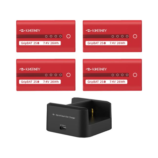 Kinefinity 4x GripBAT 2Si and PD Hybrid Dual Charger Pack The GripBAT 2Si is a 3500mAh/26Wh high capacity battery that is able to bear high current work. Compatible with NP-F550/F570, the GripBAT 2Si can be widely used with accessories such as wireless video transmitter, monitor, wireless lens control in the film industry. Moreover, its capacity is 75% higher than regular 2000mAh batteries in the market, strong power with long endurance. Besides the super high capacity 3500mA, the battery cell and built-in PCB give GripBAT 2Si the ability to support high current and high load output, that means it supports continuous output current up to 5A and continuous output power up to 40W to meet harsh environment. Not limited to these, built-in PCB not only adds protections to regular overvoltage, undervoltage, overcurrent and over-temperature, but has the power to output continuous high current and protect higher overcurrent. Extensive Applications Benefiting from the broad use of NP-F series batteries in the film industry, such as SmallHD monitor, Atomos monitor, Movcam Wireless Lens Control, Wireless Video Transmitter and Receiver, and film lights from Aputure, Nanguang, etc, as well as the NBox livestream box and so on, the GripBAT 2Si with super high capacity is sure to work with above products. With the advantage of 75% higher than regular NP-F550 in capacity, the GripBAT 2Si is portable to use with enough electricity though its volume is a fraction of NP-F750! The GripBAT 2Si also serves as an UPS power source for MAVO Edge 8K: The creative power solution can not only power the MAVO Edge independently, allowing for an efficient kit space utilization, but also work as UPS power source to supply uninterrupted power to the camera when replacing V-mount batteries or BP-U30 type batteries. Red and White Color Design Though the GripBAT 2Si is compatible with SONY NP-F550/F570 battery, Kinefinity makes a creative design to the appearance of GripBAT 2Si. The red color and white color response with each other, which is feel of energy and has a distinguished recognition. With Kinefinity whole-new PD Hybrid Dual Charger, charging time for one GripBAT 2Si is only 60 min and for two GripBAT 2Si is only 90 min. Specification: Nominal Output Voltage: 7.4V; Output Power: 26Wh; Nominal Capacity: 3500mAh; Maximum Output Power: 40W; Maximum Output Current: 5A; Work Temp: 0~40 Celcius; Weight: 104g; Size: 2.7 1.5 0.7 / 70x38x20mm PD Hybrid Dual Charger PD Hybrid Dual Charger is a newest rapid dual charger based on PD protocol. Its greatest strength is automatically identifying and rapidly charging the NP-F and BP-U batteries at one time without extra settings. Featured with max charge power 60W, the dual-slot charger has a great collaboration with 65W PD Power Adapter. In this case, charging two GripBAT 4S 52Wh to 80% only takes 90 mins and charging two GripBAT 2S 26Wh to 80% only takes 60 mins, 2~4 times faster than the regular charger. It weighs only 61g, smart and portable to use. Extensive Compatibility PD Hybrid Dual Charger best matches 64W PD Power Adapter. Thanks to the broad support and application of PD protocol, the hybrid charger can be used with most charging plug or AC Power Adapter that support PD protocol in the market, such as 61W or 30W AC Power Adapter with PD type-c port from Apple Inc. You can even use Kinefinity PD KineBAT 75/150 or Apple Macbook Pro/Air USB-C with PD Hybrid Dual Charger to charge BP-U30/NP-F550 batteries. Hybrid charger means that the PD Hybrid Dual Charger is able to automatically identify and charge NP-F and/or BP-U batteries, no need to purchase different chargers. Moreover, the small guy can not only charge two BP-U batteries or two NP-F batteries simultaneously, but charge one BP-U battery and one NP-F battery at a time! NP-F550/570/970 and BP-U30/60/90 are the popular portable batteries in the film industry. GripBAT 4S is compatible with BP-U30 battery, which is able to work on MAVO/TERRA or SONY FS5/FS7/FX9; and NP-F batteries are widely applied to SmallHD, Atomos monitor, Movcam wireless focus, film lights and NBox livestream box. Ideal for High Capacity Batteries With the improvement of battery cell technology, batteries are more and more manufactured with high capacity cell, for example, 3400mAh and 3500mAh with 18650 Li-ion battery cell. But the current rapid charger in the market can only charge the low campacity batteries (1000~2000mAh), such as BP-U30 dual charger with charge current 500~800mA only, that means, charging a 3500mAh (52Wh) GripBAT 4S to full is only in 6~8 hours. PD Hybrid Dual Charger is particularly suitable for BP-U or NP-F batteries over 3000mAh, such as GripBAT 2S 26Wh (3500mAh, NP-F550 compatible) and GripBAT 4S 52Wh (3500mAh, BP-U30 compatible). Connected with 65W PD Power Adapter, the charging current can up to 3A when the PD Hybrid Dual Charger only charges single channel batteries; the single channel charging current is up to 2A, 2x2A totally when the hybrid charger charge dual channel batteries. For instance, charging two GripBAT 4S 52Wh to 80% only take 90 mins, 2~4 times faster than the regular charger. Specification: USB Type-C PD Input: 20V/15V/9V@3.25A (Recommend 65W or above) Compatible batteries: BP-U or NP-F battery; MAX charging power: 60W; MAX charging current: single channel 3000mAx1 or dual channel 2000mAx2; Self-adaptive charging voltage: 16.8V or 8.4V, auto-identify batteries without extra settings.