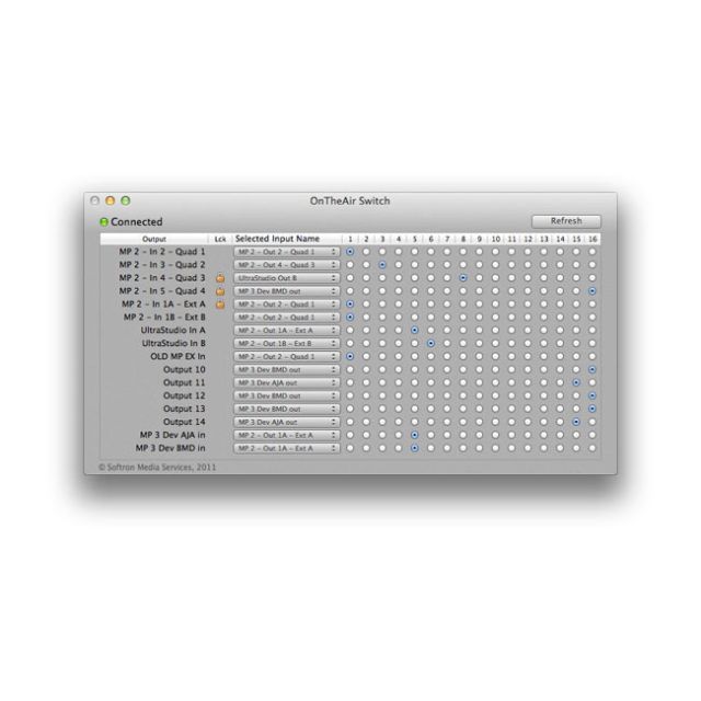 Softron OnTheAir Switch Control your video switcher by AppleScript Easy integration with other applications Control many matrix video switchers through RS232 Control Blackmagic-Design Videohub or AJA Kumo through Ethernet AppleScriptable Can be controlled directly from OnTheAir Video or OnTheAir Node for automatic switching OnTheAir Switch can control many matrix video switchers through RS232 or Ethernet. The application is AppleScriptable allowing it to be controlled from any application (even applications from third parties).. It can be used as a standalone application or integrated with OnTheAir Video, MovieRecorder or OnTheAir Node. Check the specifications page to see which router is supported. We can theoretically support any video router, but we need to implement the protocol for it of course. Before buying OnTheAir Switch, you can check the specifications page to check which Matrix Video Switcher is already supported and if yours is not in the list, simply contact us to ask if your Switcher can be supported and how to proceed.