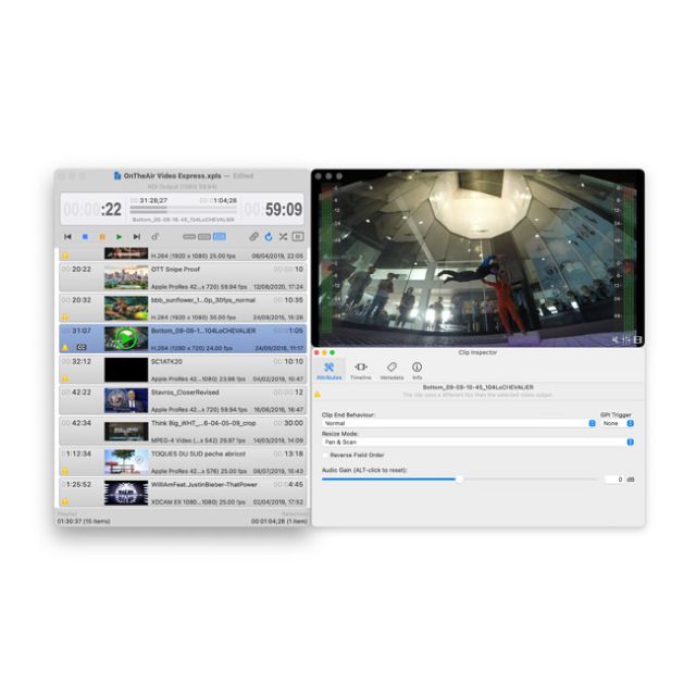 Softron OnTheAir Video Express 4 An affordable playout solution for live productions Open playout solution for the Mac Supports most file wrappers (QuickTime, MXF, ts) Supports most video codecs (Apple ProRes , Avid DNxHD , DVCPRO HD, H.264, MPEG-2, XDCAM EX , XDCAM HD ,...) Still image playback Supports clips with alpha channel Control playback from production switcher using GPI OnTheAir Video Express is an easy-to-use professional playout application. Create as many playlists as you want, and play them within seconds. OnTheAir Video Express uses the same playout engine as OnTheAir Video and OnTheAir Node, but it does not have any graphic overlay feature, nor the smart resize (it has a "standard" resize though). Make sure to check the "Features" section to check the differences between each product. Main features Mix-and-match multiple codecs Play multiple codecs in the same playlist. Support for Apple ProRes , AVC-Intra, Avid DNxHD , H.264, XDCAM EX, XDCAM HD and many more codecs. (check the list in the Tech Specs section). You do not need to install any additional software or codec. You can even mix different resolution in the same playlist. Playout multiple channels on one Mac (one license per output required) With the Smart Playout Engine's unequaled efficiency, you can playout 4 channels of HD simultaneously on one Mac as the Smart Playout Engine (SPE) is optimized to take advantages of multiple cores. For that you will need the Quad version of OnTheAir Video Express, and to purchase one license of the software per channel you want to output. Mix and Match different resolutions You can drag and drop clips of different resolutions in the playlist and they will be scaled automatically to fit in the output resolution by choosing a resizing method (letterbox, pand&scan or fill). Note that the Smart Resize mode is not available in OnTheAir Video Express, only in OnTheAir Video and OnTheAir Node. Check the screenshots below to see the difference, or check this video (the difference can only be seen in the higher resolutions 720p and 1080p) Play videos or still images Play out movie files and still images in the same playlist. Set a play duration for your still images and they will play out for that duration just as if they were a standard video file. GPI Control for integration with Video Mixer Control OnTheAir Video Express from a video mixer. When pushing on a video mixer button, you can send a GPI trigger which will start or stop a clip in OnTheAir Video Express (this feature requires GPI Commander to convert GPI triggers to USB)