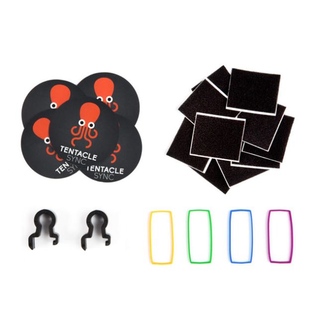 Tentacle Sync Accessory Kit for Tentacle Sync E Bundle of additional clamps, coloured rubber bands and velcro loop pads for Tentacle Sync E boxes. Features: 2 x Clamps for locking right-angle jacks 4 x Coloured rubber bands 10 x Velcro loop pads 5 x Tentacle stickers