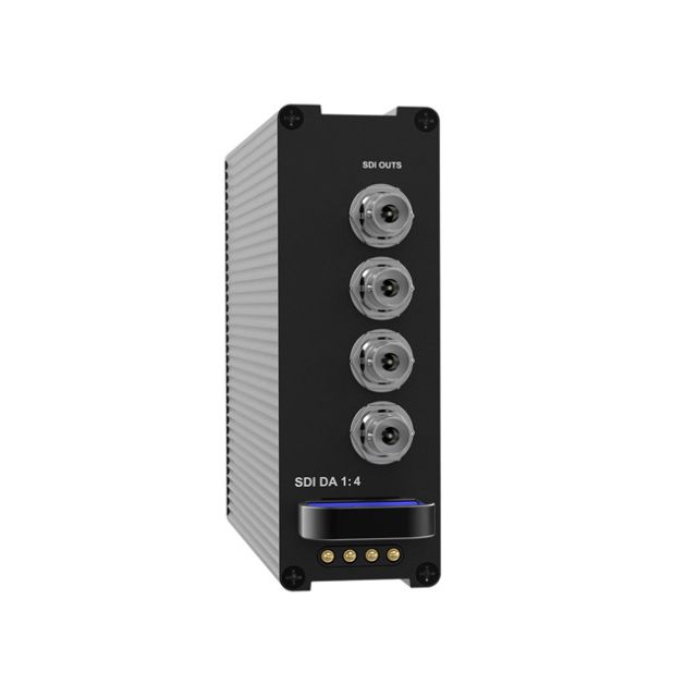 Theatrixx SDI Distribution Amplifier 1:4 Reversible Module The SDI Distribution Amplifier 1:4 Reversible Module fits in the 8-BayReversible Rackmount Converter system. The module can be inserted in the 8-Bay Frame in either direction, allowing the inputs/outputs to be positioned either at the front or the back of the unit depending on the application. There are no exposed PCBs as all modules are enclosed, and therefore protected against static shock, dust and general wear and tear. Gold-plated, redundant spring pins with magnetic retention deliver DC power to the modules, meaning no messy cabling and external power bricks are needed. Specifications Connections Video Input: 1 x 3G/HD/SD SDI BNC Video Output: 4 x 3G/HD/SD SDI BNC (reclocked and amplified) Supported Signals 3G Format Support: 1080p50, 1080p59.94, 1080p60 HD Format Support: 720p50, 720p59.94, 720p60, 1080i50, 1080i59.94, 1080i60, 1080p23.98, 1080PsF23.98, 1080p24, 1080PsF24, 1080p25, 1080PsF25, 1080p29.97, 1080PsF29.97, 1080p30, 1080PsF30 SD Format Support: 525/23.98 NTSC, 525/29.97 NTSC.625/25 PAL SDI Audio Sampling: Sample rate of 48 kHz and 24 bit SDI Color Space: YUV and RGB SDI Auto Switching: Automatically detects incoming signal format SMPTE Standards: 425 M Level A & B, 424 M, 292 M, 259 M Physical Height: 121.5 mm (4.78 in) Depth: 225 mm (8.85 in) Width: 41 mm (1.61 in) Weight: 710 g (1.56 lbs) Alternate Form Factor: Also available as a standalone converter Environmental Specifications Relative Humidity: 0% to 90% non-condensing Operating Temperature: 0-40 C Power Requirements Power Supply: Reversible redundant power fed by XVVRF8 (8-Bay Rackmount Frame) Power Consumption: 20W Voltage Range: 12VDC In the box Theatrixx Reversible Module SDI Distribution Amplifier 1:4