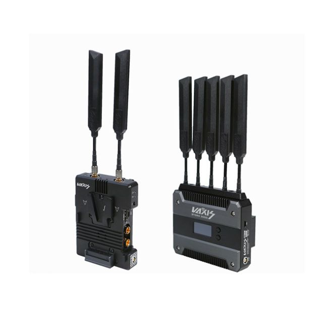 Vaxis Storm 3000DV Kit 1:1 (V-Mount) Key Features Transmitter & Receiver Kit Transmit Wireless Video up to 3000' Supports up to 1080p Uncompressed Video Dual V-Mount Pass-Through Plates on TX SDI & HDMI Inputs, SDI Outputs Supports Metadata and Timecode HDMI/SDI Cross Conversion 1/4"-20 Mounting Threads With the Storm 3000DV Wireless Kit with V-Mount Plates from Vaxis you can transmit visually lossless, uncompressed video signals from the transmitter to the receiver with zero latency. The transmitter features dual V-mount pass-through plates as well as HDMI/SDI inputs and outputs. The receiver also features a V-mount plate and features one HDMI and two SDI outputs. The system supports input up to 4K and up to 1080p60 video transmissions, cross conversion from HDMI input to SDI loop output on transmitter, 2-pin power input, the 5 GHz wireless band, and each features 1/4"-20 mounting threads. Vaxis Storm 3000' DV Wireless Video Transmitter with Dual V-Mount Plate With the Storm 3000' DV Wireless Video Transmitter from Vaxis you can transmit visually lossless, uncompressed video signals to any Vaxis Storm receiver with zero latency. The unit features a dual V-mount plate which allows you to attach it to the V-mount plate on your camera and mount a V-mount battery on the other side, providing pass-through power to both the transmitter and the camera simultaneously. The transmitter features one HDMI input, one SDI input, and one SDI loop output, and it supports input up to 4K and up to 1080p60 video transmissions. The unit also supports cross conversion from HDMI input to SDI loop output. The transmitter unit can be secured to a camera or other SDI/HDMI video source via a built-in 1/4"-20 threaded hole. The included short antennas provide connectivity for short distances of a few hundred feet, while the larger blade antennas transmit a powerful line-of-sight signal up to 3000'. It also supports the transmission of timecode, metadata, and timecode trigger information. The Storm 3000 transmitter features 20 selectable 40 MHz channels and a 5.1 to 5.9 GHz wireless frequency range, and on the side is a bright LED display showing your connection status and channel information. The unit can be powered using its 2-pin LEMO port using a D-Tap or AC source with a separately available cable. A standard BNC cable is included so you can plug in right out of the box. Transmitter unit sends up to 1080p wireless video up to 3000' One SDI and one HDMI input; one SDI loop output Compatible with all Vaxis Storm receivers Dual V-mount pass-through battery plate allows you to power the transmitter and your V-mount camera or device at the same time HDMI/SDI cross conversion support Metadata, timecode, and timecode trigger support Bright LCD screen for settings, status, and scanning for open frequencies on 5.1 to 5.9 GHz range Mount on rig using 1/4"-20 thread Vaxis Storm 3000 Receiver (V-Mount) Receive signals from your Storm 3000 transmitter with this Vaxis Storm 3000 Receiver, which is 40% smaller than previous versions and capable of receiving signals up to 1000' further away, even in complex RF environments. This V-mount receiver allows you to add a second receiver to your existing Storm 3000 transmitter/receiver kit. Enjoy the system's professional transmission mode, which is close to 0 ms latency, making this suitable for live event and news use as well as for narrative and documentary filmmaking. An antenna cover helps protect the most frequently damaged part of wireless systems and serves to extend the service life of each antenna. What s In The Box 1x Vaxis Storm 3000' DV Wireless Video Transmitter with Dual V-Mount Plate 2 x Blade Antenna (5 dBi) 2 x Short Antenna (2 dBi) 1x SDI Cable 1x Vaxis Storm 3000 Receiver (V-Mount) 1x Power Cable 5 x Blade Antenna 1x Noga Arm 1x Flight Case