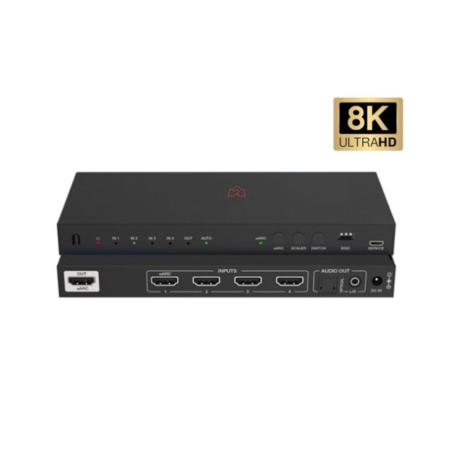 VigilLink 4x1 HDMI Switch with Audio De-embedded (48Gbps) This 8K HDMI 4x1 Switcher can switch any of the four HDMI source signals to one HDMI display, with video resolution up to 8K@60Hz 4:2:0. It supports advanced EDID management, CEC control, ARC/eARC and audio de-embedded function (Output through the optical and analog audio port). Furthermore, firmware upgrade via USB Type C port is supported. This multi-functional product can be widely applied in scenarios of demonstration, video conference, multimedia teaching and other occasions requiring for big-screen demonstration. Featured Highlights HDMI 2.1 and HDCP 2.3 compliant Support 48Gbps FRL and 18Gbps TMDS video bandwidth Video resolution is up to 8K@60Hz 4:2:0 12bit, 8K@30Hz 4:4:4 12bit, 4K@120Hz 4:4:4 12bit HDMI 2.1 protocol: VRR, ALLM, QMS, QFT, SBTM are supported Support HDR, HDR10, HDR10+, Dolby Vision, HLG pass-through Support HDMI audio formats: LPCM 7.1CH, Dolby TrueHD, Atmos and DTS-HD Master, DTS:X Audio pass-through Features 4 x HDMI inputs routed to 1 x HDMI output Support HDMI input and TV eARC audio de-embedded to SPDIF and L/R audio output Support HDMI input and TV eARC audio to output to SONOS ARC & Beam or any eARC soundbar Support CEC control from TV at output to source at input Support CEC volume control from TV to any eARC sound system Support advanced EDID management Package Contents 1 8K HDMI 4x1 Switcher 1 5V/1A Power Adapter (USA Standard) 1 IR Remote 1 User Manual