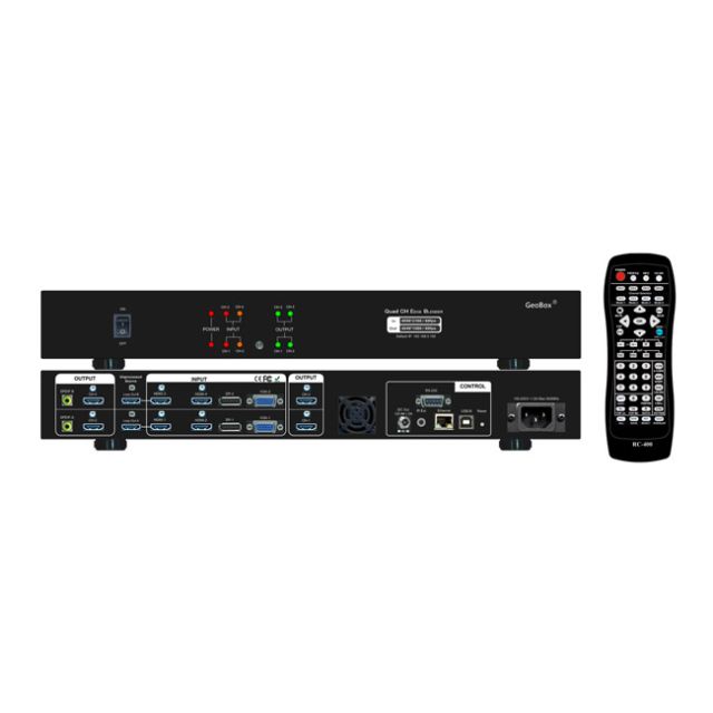 VigilLink G814 Quad Channel Edge Blender Introducing the G814: Your Ultimate Quad Channel Curved Screen Edge Blending Processor The G814 is a powerhouse, a quad-channel professional curved screen edge blending processor designed to elevate your visual experiences to new heights. Whether you're into sophisticated edge blending, image warping, stacking, or projection mapping, the G814 is your all-in-one solution. Comprising two G812 processing modules, it can also function as a dual G812 setup. Unmatched Connectivity and Processing Power With eight inputs 4x HDMI, 2x DP, and 2x VGA coupled with four HDMI outputs, the G814 offers unparalleled connectivity. It supports input resolutions up to 7680x1200 @30Hz and 4096x2160 @60Hz with 4:4:4 full-color sampling, while its output capabilities reach up to 2048x1080 @60Hz. Under the hood, a 10-bit high-end processor, motion adaptive de-interlace, and a low-angle smooth algorithm ensure your content shines. Non-VESA standard input timing support means compatibility with various input sources. Advanced Warp Technology for Precision Geometry Our advanced warp technology, seamlessly integrated into the G814, empowers you to achieve precise geometry alignment and curved screen edge blending. Control is at your fingertips through the remote controller, WebGui, USB, or Ethernet. Fine-tune with confidence, thanks to a maximum of 17x9 grid control points with 120x68 pixel position adjustments. The Linearity Grid Line Adjustment and "W" type Corner Wall image adjustment enhance your geometry alignment toolkit. Perfect Color Control and Uniformity The G814 offers separate RGB gamma correction for edge blending color fine-tuning and individual color correction for each output. Achieve fine pixel color uniformity and optimize visuals with nine regions for non-edge blending area black level uplift. Witness real-time geometry and color adjustments for an optimized visual experience. Seamless Connectivity and Video Wall Function Experience hassle-free connectivity with HDMI 2.0 loop-out support, enabling daisy-chaining of multiple units, reaching up to 7680x1200 @30Hz. The G814 simplifies complex setups with its video wall function, allowing you to crop and allocate source images for each projector and set overlap pixels for flawless edge blending. Bid farewell to PC software, video distributors, and splitters. Customizable EDID and Versatile Input Support The G814 is designed to support programmable EDID and non-VESA standard input. Create custom EDID timings ranging from 1024x768 to 3840x2400, optimizing your video performance with ease. Cost-effective, Reliable, and Flexible Say goodbye to high-end projectors, as the G814 allows you to switch to low-cost projectors without lens shift, warp, or edge blending. It offers an accessible configuration, a low entry barrier, cost-effectiveness, and unwavering reliability for professionals seeking a flexible visual solution. Dual Power Supply Options for Your Convenience The G814 boasts a dual power supply system, accommodating both AC power (100V-240V) and DC power (12V 2A) via an external DC 12V power adapter. When using AC power, you'll even have access to one DC 12V 1A output for signal extension. Your standard delivery includes an AC power cord for immediate setup. Elevate your visual content to unprecedented levels with the G814. Experience the future of visuals with uncompromising edge blending, image warping, and projection mapping. Embrace the G814 it's where limitless possibilities meet unmatched performance. Featured Highlights: With popular USB-C interface APEdge blending Up to 120 68 points of geometric alignment for sophisticated image warping. Embedded video wall function, no image splitter is required. 4K loop out port for daisy chain connection in cascade application. Easy configuration via IR remote, PC tool, or WebGUI. The GeoBox Edge Blending Processor offers seamless curved edge blending capabilities for up to four projectors from a single unit, with the option to control additional projectors by linking multiple processors. This innovative device incorporates advanced warp technology, enabling users to achieve exceptional performance even with cost-effective projectors. It operates as a self-contained hardware system, providing users with multiple control options, including IR remote, USB, RS232, or Ethernet, eliminating the need for additional PCs, Zero Clients, or software tools.