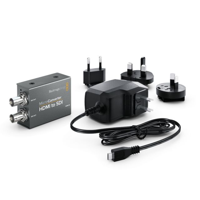 Blackmagic Micro Converter - HDMI to SDI with Power Supply Take the HDMI output from laptop computers or consumer cameras and convert it to SDI for use with broadcast switchers, routers, monitors and more! The multi rate 3G-SDI automatically switches between all SD and HD formats up to 1080p60. You get 2 SDI outputs, support for Level A and Level B equipment, and power over USB Connections SDI Video Outputs Automatically matches the SD, HD or 3G-SDI HDMI video input. HDMI Video Inputs HDMI Type A in. Multi Rate Support Auto detection of SD or HD. Updates, Configurations and Power Micro USB. Reclocking Yes Standards SDI Video Standards 525i59.94 NTSC, 625i50 PAL HD Video Standards 720p50, 720p59.94, 720p60 1080p23.98, 1080p24, 1080p25, 1080p29.97, 1080p30, 1080p50, 1080p59.94, 1080p60 1080i50, 1080i59.94, 1080i60 SDI Compliance SMPTE 259M, SMPTE 292M, SMPTE 296M, SMPTE 372M, SMPTE 424M, SMPTE 425M SDI Video Rates SDI video connections are switchable between standard definition and high definition, and user selectable level A and B via setup utility. SDI Color Precision 4:2:2 SDI Color Space YUV SDI Auto Switching Automatically detects SD, HD and 3G-SDI HDMI Video Standards 525i29.97 NTSC, 625i25 PAL 720p50, 720p59.94, 720p60 1080p23.98, 1080p24, 1080p25, 1080p29.97, 1080p30, 1080p50, 1080p59.94, 1080p60 1080i50, 1080i59.94, 1080i60 HDMI Color Precision 4:2:2 HDMI Color Space YUV Copy Protection HDMI input is unable to capture from copy protected HDMI sources. Always confirm copyright ownership before capture or distribution of content. Software Software Control Mac OSX and Windows software via micro USB. Internal Software Upgrade Via micro USB. Operating Systems macOS 10.12 Sierra, macOS 10.13 High Sierra or later, Windows 8.1 or Windows 10. Settings Control Via software utility. Power Requirements +5V universal power supply included with international socket adapters for all countries. Power Consumption 2.0 Watts Operational Voltage Range 4.4 to 5.25V DC Physical Specifications Environmental Specifications Operating temperature 0 to 40 C (32 to 104 F) Storage temperature -20 to 60 C (-4 to 140 F) Relative Humidity 0% to 90% non-condensing What's Included Micro Converter HDMI to SDI wPSU +5V universal power supply with international socket adapters Warranty 3 Year Limited Manufacturer's Warranty.