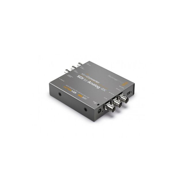 Blackmagic Mini Converter - SDI to Analog 4K The Mini Converter SDI to Analog 4K from Blackmagic Design allows you to convert Single Link SD/HD/3G/6G-SDI to analog SD/HD component, composite, or S-Video. The down-converter lets you to connect professional SDI equipment which outputs resolutions up to Ultra HD 4K (3840 x 2160) and DCI 4K (4096 x 2160) with SD and HD analog video monitors and other equipment. With a compact form factor and easy-to-use controls, the Mini Converter is ideal for a variety of broadcast, post production, and professional AV applications. Using 6G-SDI technology, the Mini Converter supports resolutions up to UHD 4K at up to 30 fps and DCI 4K at 24 fps. The Mini Converter also supports Single Link SD, HD, and 3G-SDI signals and automatically detects the input video format and instantly changes. A redundant SDI input is provided as an optional back up, and an SDI loop-through output is available for sending the SDI signal to an additional device. Up to 16 channels of de-embedded SDI input audio can be outputted as AES/EBU digital audio or balanced analog audio output via 1/4" output jacks. The Mini Converter's settings are controlled using the built-in DIP switches or via USB using the included software for Max OS X or Windows computers. The USB port also enables the firmware to be updated. For powering the device, a 12V power supply is included with international socket adapters. Product Highlights Single Link SD/HD/3G/6G-SDI Input Component, Composite, & S-Video Output SD, HD, UHD 4K & DCI 4K Input Signals Automatic Input Signal Detection Redundant SDI Input & Looped SDI Output Analog & AES-EBU Digital Audio Outputs 24-bit, 48 kHz Audio Control via DIP Switches or Software USB 2.0 Port for Firmware Updates 12V Universal Power Supply Included Additional Features 4:2:2 Sampling and color precision 24-bit, 48 kHz audio sampling Compliant with SMPTE 292M, SMPTE 259M, SMPTE 296M, ITU-R BT.656, and ITU-R BT.601 standards