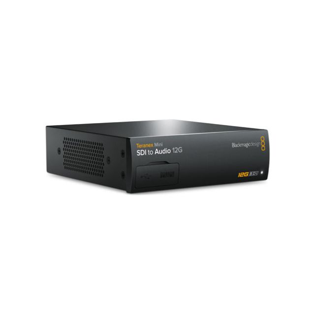 Teranex Mini - SDI to Audio 12G De-embed audio from any SD, HD or Ultra HD SDI video connection and output 2 channels of analog audio to balanced XLR, optical or HiFi RCA, or output up to 4 channels of AES/EBU digital audio. Perfect for converting and outputting SDI audio to a massive range of audio equipment such as audio mixers, iPods, analog broadcast decks, audio monitors and more. Connections SDI Video Input 1 x 12G-SDI SD/HD/2K/4K auto switching. SDI Video Output 1 x 12G-SDI loop output. AES/EBU Audio Output 4 channels professional 110 balanced digital audio via XLR connectors. Right XLR can be configured for timecode output. Analog Audio Output 2 channels professional balanced analog audio via XLR connectors, or 2 channel unbalanced analog line level via RCA connectors. Right XLR can be configured for timecode output. Optical Audio Output S/PDIF Signal with TOSLINK Connector. Multi Rate Support Automatic switching between SD/HD/2K and 4K. Updates and Configuration USB or Ethernet. Re-Clocking Yes Standards SD Format Support 525/29.97 NTSC, 525/23.98 NTSC, 625/25 PAL HD Format Support 1280 x 720p50, 1280 x 720p59.94, 1280 x 720p60, 1920 x 1080i50, 1920 x 1080i59.94, 1920 x 1080i60, 1920 x 1080PsF23.98, 1920 x 1080PsF24, 1920 x 1080p23.98, 1920 x 1080p24, 1920 x 1080p25, 1920 x 1080p29.97, 1920 x 1080p30, 1920 x 1080p50, 1920 x 1080p59.94, 1920 x 1080p60. 2K Format Support 2048 x 1080p23.98, 2048 x 1080p24, 2048 x 1080p25, 2048 x 1080PsF23.98, 2048 x 1080PsF24, 2048 x 1080PsF25. 4K Format Support 3840 x 2160p23.98, 3840 x 2160p24,3840 x 2160p25, 3840 x 2160p29.97,3840 x 2160p30, 3840 x 2160p50,3840 x 2160p59.94, 3840 x 2160p60,4096 x 2160p23.98, 4096 x 2160p24,4096 x 2160p25, 4096 x 2160p29.97,4096 x 2160p30, 4096 x 2160p50,4096 x 2160p59.94, 4096 x 2160p60 SDI Compliance SMPTE 292M, SMPTE 259M, SMPTE 296M, SMPTE 372M, SMPTE424M-B, SMPTE 425M, ITU-R BT.656, ITU-R BT.601, SMPTE ST-2036 SDI Video Rates SDI video connections are auto switching between standard definition SDI, high definition level B 3G-SDI, 6G-SDI, and 12G-SDI. SDI Auto Switching Automatically selects between SD, HD, 3G, 6G and 12G-SDI. SDI Video Sampling 4:2:2, 4:4:4 SDI Audio Sampling Television standard sample rate of 48kHz and 24-bit. SDI Color Precision YUV 4:2:2 and RGB 4:4:4 in HD, 2K and 4K. SDI Color Space REC 601, REC 709 Software Software Control Mac OS X and Windows software upgrade via USB and Ethernet. Internal Software Upgrade Via included updater application. Settings Control Basic Settings Control Mini Switches, USB and Ethernet via free software utility Optional Front Panel Control Front mounted Smart Panel with LCD, rotary knob and six settings buttons Power Requirements Power Supply 1 x built-in international AC power supply with IEC C14 inlet. IEC Power cable required. 90 - 240V AC Input. Power Over Ethernet Can be powered via 48V DC using PoE (power over ethernet). Power Consumption 15 Watts Operational Voltage Range 90 - 240V AC Physical Specifications Environmental Specifications Operating Temperature 0 to 40 C (32 to 104 F) Storage Temperature -20 to 60 C (-4 to 140 F) Relative Humidity 0% to 90% non-condensing What's Included Teranex Mini - SDI to Audio 12G Software SD Card Warranty 3 year Limited Manufacturer s Warranty.