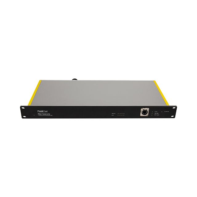 FieldCast Fiber Base One (Remote Control Station for 4 PTZ Cameras) FieldCast Fiber Base One is a four channel fiber optic converter, designed as a remote unit for FieldCast Fiber Node One. It sports one SMPTE connector and needs one SMPTE 311M/304 fiber optic cable to connect to Fiber Node One, to power it and to communicate with it. At its input, Fiber Base One accepts any voltage level between 100 and 240VAC, and the output level of the SMPTE connector is equal to the input level. So, when you plug into a 220V power outlet, the SMPTE connector simply offers 220V. Fiber Base One brings you four channels of 3G SDI output and ethernet I/O, just like Fiber Dock One and Fiber Node One, and you can connect straight to the switcher, plug in one or more PTZ controllers, add a multiviewer, recorders, whatever you want. Communication with Fiber Node One is pretty straightforward. One fiber of the SMPTE cable is used to tap into the fiber optic ethernet switch of Fiber Node. This means that a PTZ controller connected to Fiber Base is part of the same network as a PTZ controller connected to Fiber Node, and both can control any PTZ camera in the network. The other fiber of the SMPTE cable forwards all four video signals that reached Fiber Node One to Fiber Base One, which means that the four SDI outputs of both Fiber Node One and Fiber Base One output exactly the same signals. In other words, when connected, Fiber Base One, the remote system, and Fiber Node One, the local system, are functionally equivalent and can work together. Typically, Fiber Base One will be placed in a control room or OB Van and connects to the switcher, where Fiber Node One will be mounted in a flightcase and connects to a portable multiviewer
