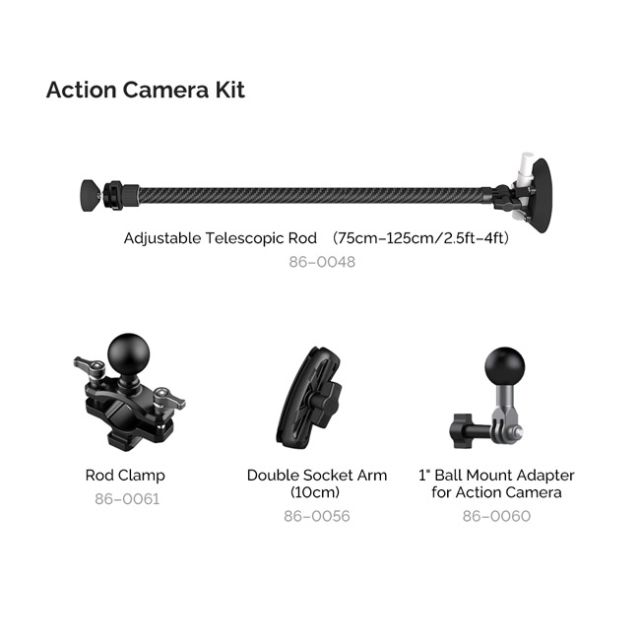 MOVMAX Adjustable Telescopic Rod - Action Camera Kit The Movmax Adjustable Telescopic Rod - Action Camera Kit includes all of the features of the Movmax Adjustable Telescopic Rod (75-125cm/2.5ft-4ft), plus a number of additional features that make it ideal for use with action cameras. These additional features include: A dedicated action camera mount: This allows you to securely mount your action camera to the rod. A remote control: This allows you to control your action camera remotely. A carrying case: This makes it easy to transport and store the kit. Key features: Dedicated action camera mount Remote control Carrying case Adjustable height: Accommodates various car models and shooting angles. Carbon fiber construction: Lightweight, strong, and minimizes vibrations. Dual support system: Top suction cup and adjustable bottom cup feet for secure mounting. Versatile attachments: 1" ball connector and Nato clamp for a wide range of accessories. Multi-module design: Expandable for different shooting setups. 360-degree adjustability: Ball heads on both ends for flexible positioning. The Movmax Adjustable Telescopic Rod - Action Camera Kit is compatible with a wide range of action cameras, including GoPro, Sony, and Insta360 cameras.