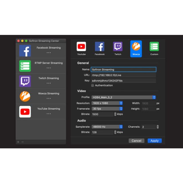 Softron Streaming Pack for Softron Applications (currently Movie Recorder/Movie Recorder Express) The easiest RTMP and RTSP streaming solution on the Mac One license for multichannel streaming Stream live up to 6 HD channels on a Mac mini RTMP or RTSP support Stream to your Wowza server Direct integration with Facebook, YouTube or Twitch Presets can be used with any* Softron application running on the same Mac Free DEMO version available Stream to your own RTMP or RTSP server, to your Wowza server or directly to Facebook, YouTube or Twitch using a single Softron Streaming Pack license and any one of the following Softron applications: MovieRecorder (Express)*, OnTheAir Video (Express)* OnTheAir Node*, OnTheAir CG*. Softron Streaming Pack's built-in integration for Facebook, YouTube, Twitch or any RTMP server (like Wowza) allows you to log in to the service or services you want to stream to and, depending on your Mac's capabilities, stream as many channels as you want. That's value. That's ease of use. That's what Softron software is all about. One license for multichannel streaming One Softron Streaming Pack license, adds the ability to stream using any Softron application* running on the same Mac. Just create a preset in the new "Streaming Center" application and it will be available to use with all* the other Softron licenses you have on your Mac, without any limits in the number of channels, except of course the capability of your Mac to encode H.264. * Currently available with MovieRecorder and MovieRecorder Express. Support for other applications will come soon. Get in touch with us to know when other applications will be supported. Direct integration with social media Stream directly to Facebook, YouTube or Twitch. Log in your favorite social media in Softron's Streaming Center, and start streaming your live directly from your favorite Softron application. This makes it very easy to start streaming an event, no need to go to your Facebook or YouTube page to create a live, it will all be done by Softron's Streaming Center. Use direct link with MovieRecorder Currently, Softron Streaming Pack is compatible with MovieRecorder and MovieRecorder Express. Other applications will be supported soon for streaming directly from our playout applications. But you can already stream the output of your favorite Softron playout application (OnTheAir Video Express, OnTheAir Video, OnTheAir Node, OnTheAir CG, and even M|Replay) by using the direct link feature. With the direct link, MovieRecorder and MovieRecorder Express can receive the frames directly from our playout applications running on the same Mac. You don't even need to have a video device for your playout application.