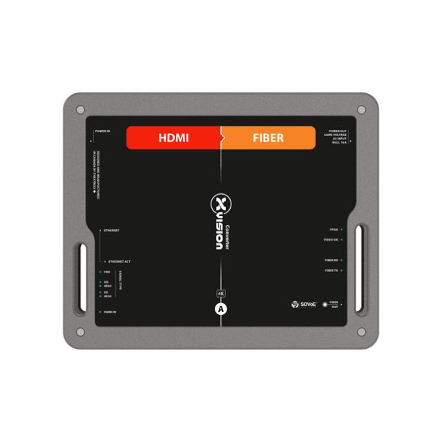 Theatrixx HDMI to Fiber Video Converter Professional equipment in mission-critical applications is all about reliability and confidence. So Theatrixx started with a clean sheet, and built what may soon become your most trustworthy piece of equipment. Introducing the world s first video converters truly designed for the road. Video converters nowadays are used everywhere on professional A/V events, presentations, live shows and tours, and often have a critical role. Yet, they are often the weakest link in the signal chain. Low quality connectors, weak enclosure, external consumer-grade power supply, and overall barebones design that all contribute to a generally unreliable piece of equipment. Theatrixx designed the xVision Video Converters to change that. The HDMI 2.0 + Ethernet to Fiber 10G xVision Converter from Theatrixx Technologies is a plug-and-play HDMI + Ethernet to 10G fiber (with optional module) video converter designed to be easily used while on the road. It features an integrated power supply with a locking powerCON TRUE1 connector and a built-in powerCON TRUE1 loop output to power an optional accessory or display. Integrated power supply with locking PowerCON connector. Never rely on a cluster of wall-warts again. Built-in convenience outlet to power nearby monitor, flat-screen, laptop, video projector or any device up to 10 amps Power bar to connect both converter and device not required anymore. Magnetic stacking system and non-skid rubber pad. Saves at least 10 gaffer tape rolls a year. Multiple mounting options: C-Clamp, wall-mount adapter, LCD mount adapter and belt adapter. Rugged, Tour-ready and aesthetic enclosure: The sexiest widget in your tool box, that will keep looking good for years to come. Plug-n-play operation ; No dipswitches, buttons or menus to fumble with: It just works. Clear and ample status LED indicators for quick troubleshooting. Easy on-the-field identification with unique color and alphabetic coding system. Locking HDMI port prevents accidental disconnection. Reclocked and amplified SDI loop thru Proudly designed and assembled in Canada. What s in the box xVision HDMI to Fiber Converter (True1) Power Cable