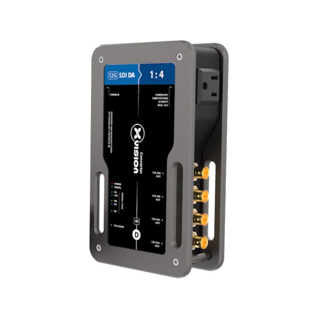 Theatrixx xVision 12G-SDI DA 1x4 Distribution Amplifier Professional equipment in mission-critical applications is all about reliability and confidence. So Theatrixx started with a clean sheet, and built what may soon become your most trustworthy piece of equipment. Introducing the world s first video converters truly designed for the road. Video converters nowadays are used everywhere on professional A/V events, presentations, live shows and tours, and often have a critical role. Yet, they are often the weakest link in the signal chain. Low quality connectors, weak enclosure, external consumer-grade power supply, and overall barebones design that all contribute to a generally unreliable piece of equipment. Theatrixx designed the xVision Video Converters to change that. Integrated power supply with locking PowerCON connector. Never rely on a cluster of wall-warts again. Built-in convenience 120 V outlet to power nearby projector, TV, laptop, small video projector Power bar to power both the converter and device not required anymore. Magnetic stacking system and non-skid rubber pad. Saves at least 10 gaffer tape rolls a year. Multiple mounting options: C-Clamp, wall-mount adapter, LCD mount adapter and belt adaptor. Rugged, Tour-ready and aesthetic enclosure: The sexiest widget in your tool box, that will keep looking good for years to come. Plug-n-play operation ; No dipswitches, buttons or menus to fumble with : It just works. Clear and ample status LED indicators for quick troubleshooting. Easy on-the-field identification with unique color and alphabetic coding system. All outputsfully reclocked and amplified. Proudly designed and assembled in Canada.