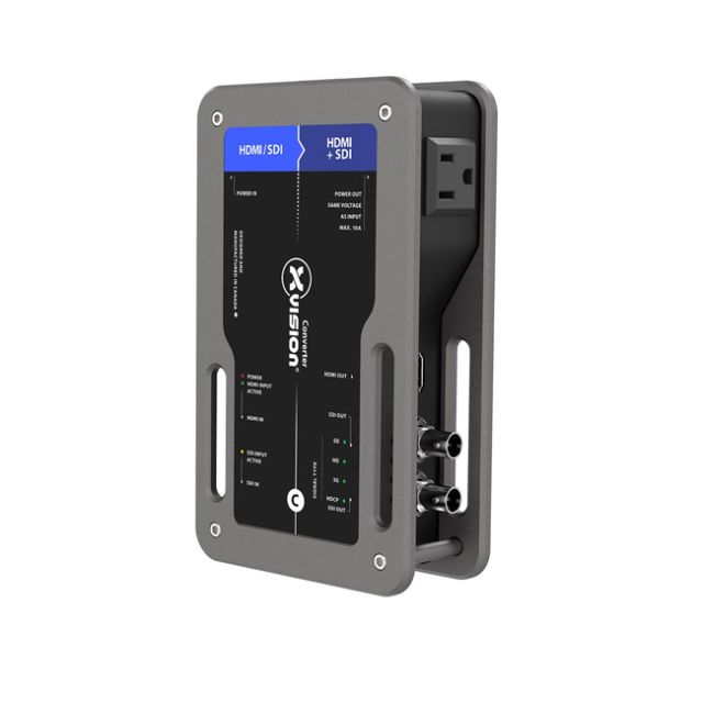 Theatrixx xVision SDI to HDMI Bi-Directional Video Converter Professional equipment in mission-critical applications is all about reliability and confidence. So Theatrixx started with a clean sheet, and built what may soon become your most trustworthy piece of equipment. Introducing the world s first video converters truly designed for the road. Video converters nowadays are used everywhere on professional A/V events, presentations, live shows and tours, and often have a critical role. Yet, they are often the weakest link in the signal chain. Low quality connectors, weak enclosure, external consumer-grade power supply, and overall barebones design that all contribute to a generally unreliable piece of equipment. Theatrixx designed the xVision Video Converters to change that. The SDI/HDMI Bidirectional Video Converter from Theatrixx Technologies is designed to be used while on the road. It features an integrated power supply with a locking powerCON connector and a built-in 120V outlet to power a nearby projector, TV, or laptop. There is an SDI input, two SDI outputs, a locking HDMI input, and a locking HDMI output. This converter has an SDI input priority. It can be mounted using a C-clamp, wall-mount adapter, LCD mount adapter, or belt adapter (available separately). Integrated power supply with locking PowerCON connector. Never rely on a cluster of wall-warts again. Built-in convenience 120 V outlet to power nearby projector, TV, laptop, small video projector Power bar to power both the converter and device not required anymore. Magnetic stacking system and non-skid rubber pad. Saves at least 10 gaffer tape rolls a year. Multiple mounting options: C-Clamp, wall-mount adapter, LCD mount adapter and belt adaptor. Rugged, Tour-ready and aesthetic enclosure: The sexiest widget in your tool box, that will keep looking good for years to come. Plug-n-play operation ; No dipswitches, buttons or menus to fumble with : It just works. Clear and ample status LED indicators for quick troubleshooting. Easy on-the-field identification with unique color and alphabetic coding system. Locking HDMI ports prevent accidental disconnection. The only converter you ll need: SDI to HDMI or HDMI to SDI with automatic incoming signal type detection. Reclocked and amplified SDI outputs. Proudly designed and assembled in Canada. What s in the box xVision Converter SDI/HDMI Bidirectional AC Mains to PowerCON cable (1.5m, specify plug type at ordering)